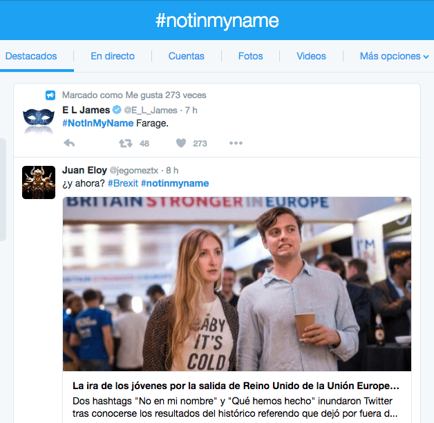 Esta generación también se manifestó utilizando el hashtag #NotInMyName (No en mi nombre), en referencia a las personas mayores de 50 años, que fueron quienes en su mayoría votaron por salir de la UE.