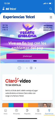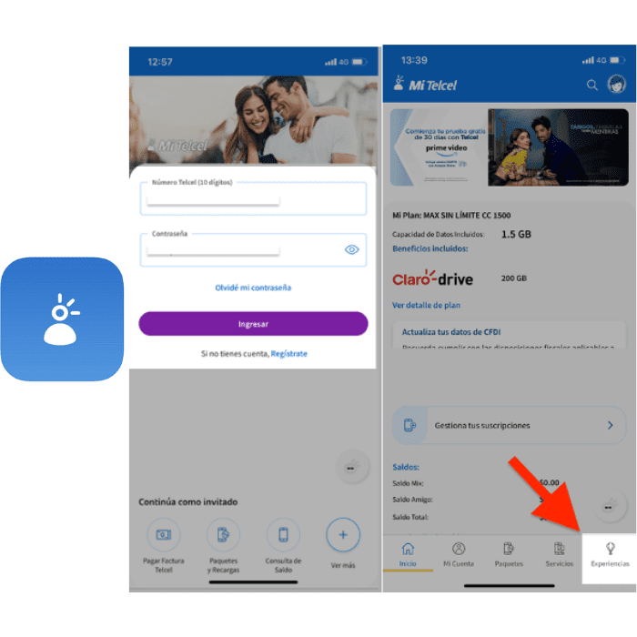- Abre la app Mi Telcel (donde consultas tú saldo y/o pagas tu factura) inicia sesión y ve a la sección Experiencias.