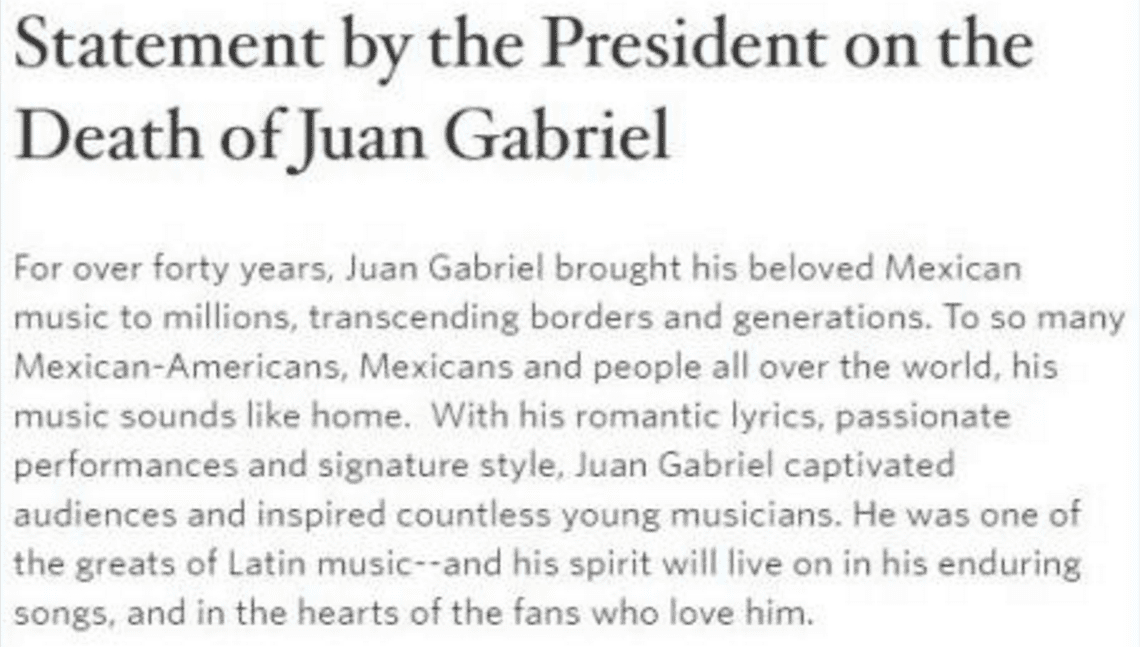 “A lo largo de 40 años, Juan Gabriel llevó su amada música mexicana a millones, misma que trascendió fronteras y generaciones. Para muchos méxico-estadounidenses, mexicanos y personas alrededor del mundo, su música suena a casa. Con sus letras románticas, presentaciones apasionadas y característico estilo, Juan Gabriel cautivó audiencias e inspiró a innumerables músicos jóvenes. Él fue uno de los más grandes de la música latina y su espíritu vivirá en sus eternas canciones, y en los corazones de los fans que lo aman”, se lee en el mensaje.