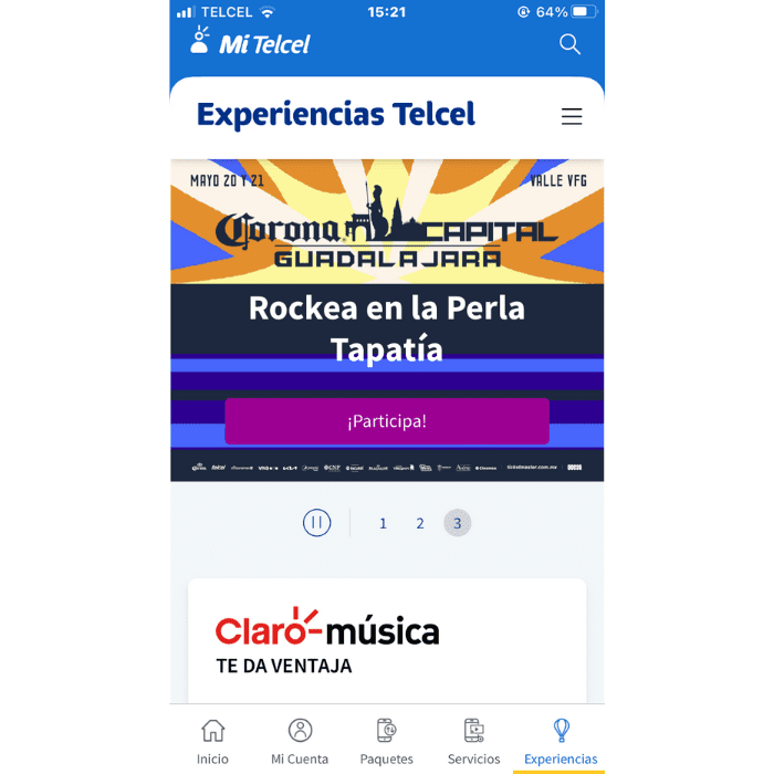 - Abre la app Mi Telcel (donde consultas tu saldo y/o pagas tu factura) inicia sesión y ve a la sección Experiencias.