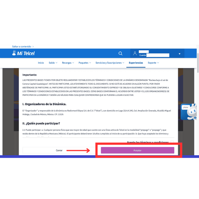 4. Una vez dentro solo Acepta los términos y condiciones, juega la dinámica ¡y listo!, estarás participando.