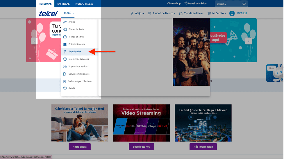 - Ingresa a telcel.com despliega el Menú y da click en la sección Experiencias, o puedes dar clic aquí: www.telcel.com/personas/experiencias-telcel
