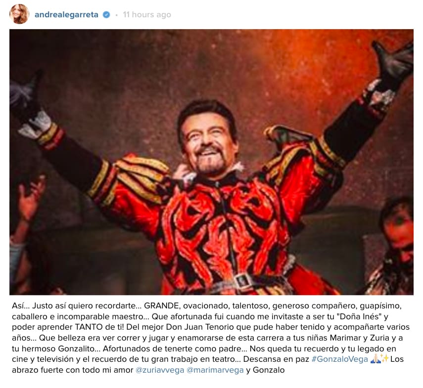 “Gonzalo murió en completa paz y tranquilidad acompañado de toda su familia, junto con sus hijos Marimar, Zuria y Gonzalo y su esposa Andrea. Recordaremos siempre a Gonzalo como un ser excepcional que dedicó su vida a entretener a los demás”, expresó la familia del actor en un comunicado.