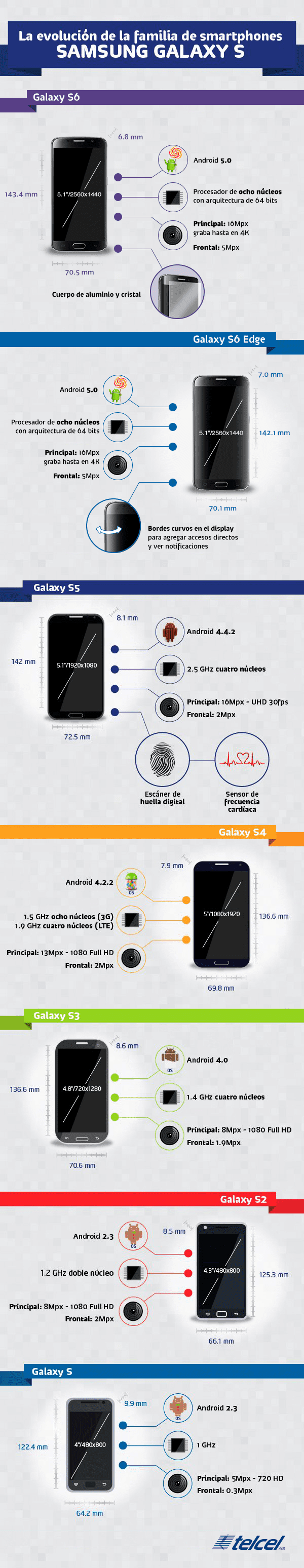 En cinco años, esta gama de teléfonos ha evolucionado de generación en generación, hasta llegar a la más reciente, con el Galaxy S6, que destaca por su pantalla Quad HD de 5.1 pulgadas, cuerpo que combina aluminio y cristal, así como por su cámara de 16 megapixeles y procesador de ocho núcleos.