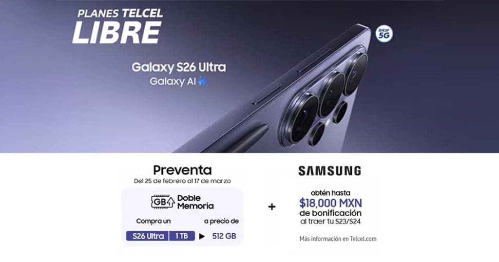 Durante la preventa puedes adquirir el Samsung Galaxy S26 Ultra de 1TB al precio de la versión de 512GB. Además, si traes tu Samsung Galaxy S23 o S24, puedes obtener hasta $18,000 de bonificación. Puedes inscribirte aquí.