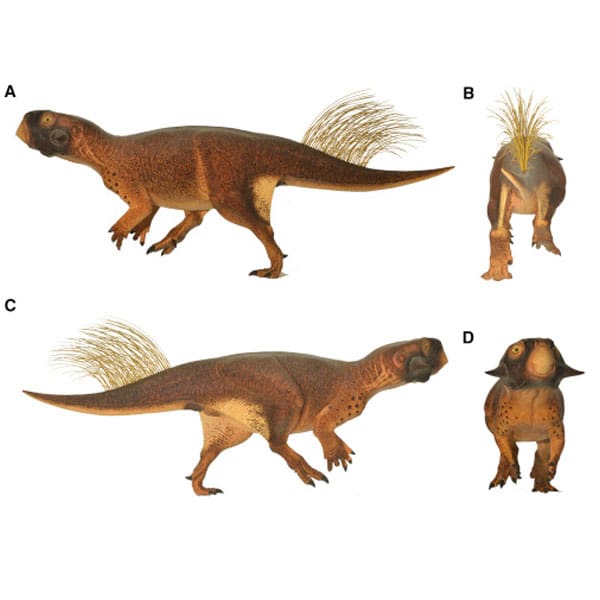 Los investigadores concluyeron que este a la vez extraño y tierno dinosaurio, con cuernos en la cabeza y cerdas largas en la cola, vivía en la etapa cretácea temprana en China, donde se han encontrado en los mismos estratos de roca restos de dinosaurios ¡con plumas!.