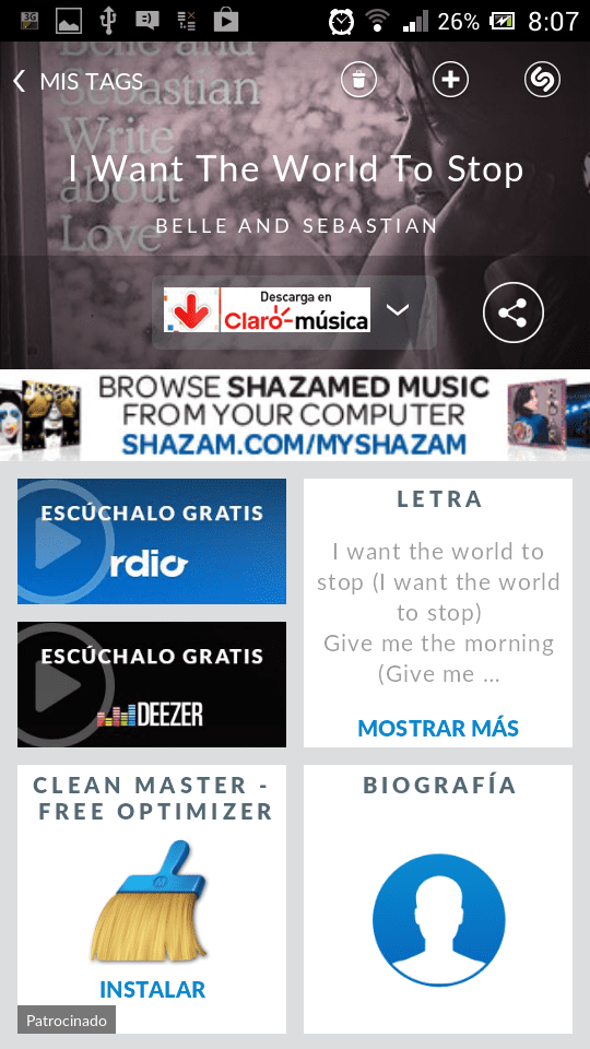 Casi instantáneamente, se despliega la información con el nombre del intérprete, el título de la canción y opciones para ver la letra y el video de la misma, así como la biografía del artista, su discografía, las fechas de sus próximos conciertos y alternativas para escuchar su rola o descargarla desde diferentes servicios musicales, como Claromúsica.