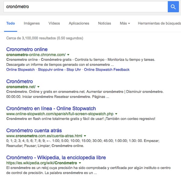 Si escribes “Cronómetro” en el buscador, hasta arriba de los resultados te aparecerá un reloj con el que podrás comenzar a contar el tiempo. Te recomendamos utilizarlo en Chrome, ya que esta apps está diseñadas para este navegador. También puedes utilizar una herramienta similar si escribes “temporizador” o “cuenta atrás”.