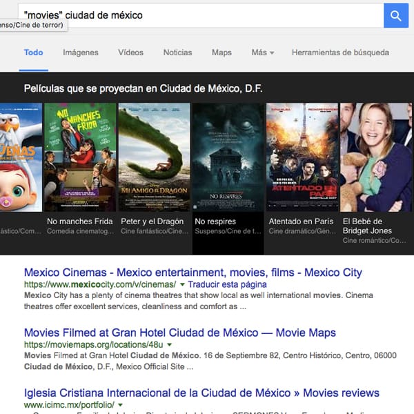 Pensada en los cinéfilos, esta una forma rápida y sencilla de saber qué películas se están proyectando en tu ciudad. Escribe la palabra “movies” seguido del nombre de tu ciudad y se te mostrará una lista de filmes por encima de los resultados. Da clic en alguna de ellas y podrás ver la página de resultados del cine en el que está disponible, los horarios, noticias y más.