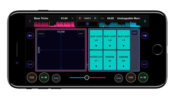 Cuenta con las funciones ya conocidas de la versión para iPad: Hot Cues, Loops, FX Pad y FX Combo, pero con un diseño optimizado para la pantalla del iPhone.