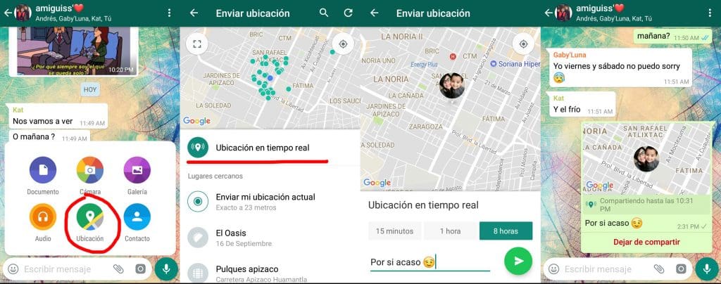 Cada vez que salgas con tus amigos y/o familiares a lugares en los que tu equipo podría ser víctima de robo o extravío, comparte a través de un chat grupal o individual, tu ubicación en tiempo real, durante el tiempo que creas conveniente. Por ejemplo, si vas al antro con tus amigos, envíasela a ellos durante ocho horas. De esta manera, si alguien toma tu smartphone podrás observar cada uno de sus movimientos desde el móvil de tu acompañante.