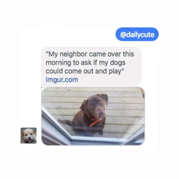 Porque no importa si estás teniendo un excelente o pésimo día, las fotos de perritos siempre animarán hasta al más amargado de tus amigos. Con tan sólo teclear “@dailycute” en alguna conversación, se enviará al instante una imagen aleatoria de mascotas.