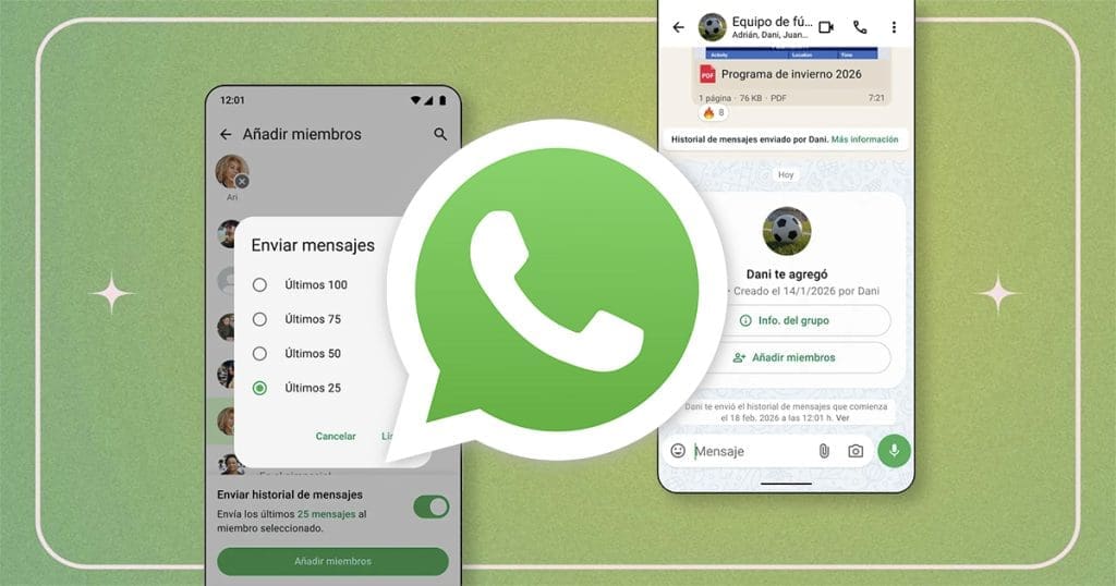 La función de historial de mensajes en grupo aparece justo cuando te agregan a un chat grupal. En ese momento, quien invita puede elegir enviar los últimos mensajes del chat para que sepas de qué se está hablando.