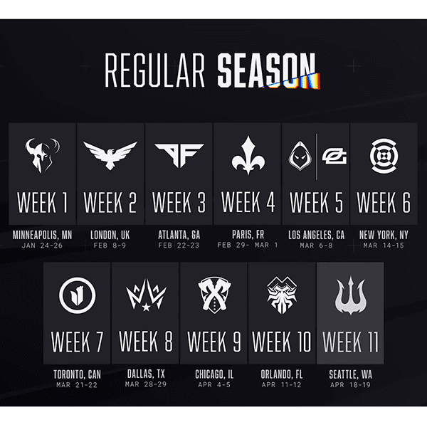 La Call of Duty League tendrá 3 niveles de competición, profesional, amateur y fans. El nivel profesional constará de 12 equipos representando ciudades de Estados Unidos, Canadá y Europa. Iniciando este 24 de enero en la ciudad estadounidense de Mineapolis con un enfrentamiento entre Toronto Ultra y Minnesota Rokkr. De ahí será un tour internacional de 22 semanas lo que dará la oportunidad de jugar de locales a todos los equipos de la liga.