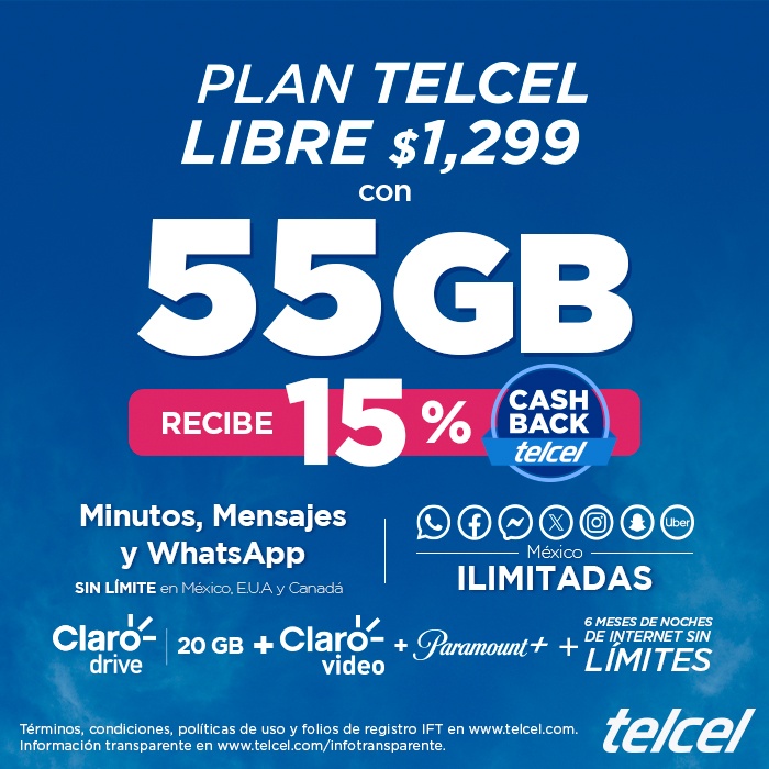 Con los nuevos Planes Telcel Libre disfruta de más GB incluidos, Minutos y SMS ilimitados en México, E.U.A. y Canadá, así como Redes Sociales ilimitadas en México y Cashback Telcel.…