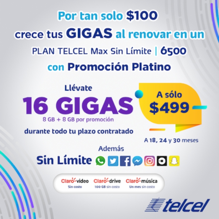 1) Los minutos y Mensajes de Texto (SMS) incluidos aplican para llamar o enviar Mensajes de Texto (SMS) con destino a México, E.U.A. y Canadá, estando dentro de México, E.U.A. o Canadá. El uso de los servicios de voz y SMS ilimitados está sujeto a la Política Antifraude en el Uso de Servicios Ilimitados disponible enwww.telcel.com/politicaantifraude, así como, de la Política de Uso de Servicios Sin Frontera disponible en www.telcel.com. 2) Los usuarios que renueven su plazo forzoso con un Plan Telcel Max Sin Límite recibirán como promoción el uso nacional ilimitado sin costo adicional de datos en el servicio de acceso a Internet para los servicios de las aplicaciones denominadas Facebook®, Messenger, Twitter®, Instagram® y Snapchat®; así como, el uso ilimitado en México, E.U.A. y Canadá de la mensajería instantánea WhatsApp®. El uso de las aplicaciones Facebook®, Messenger, Twitter®, WhatsApp®, Instagram® y Snapchat® está referido únicamente a las aplicaciones oficiales propiedad de Facebook® (incluye los dominios www.facebook.com y m.facebook.com); Twitter® (incluye los dominios www.twitter.com y m.twitter.com); Instagram LLC; Snapchat Inc. y WhatsApp Inc. NO ESTÁ INCLUIDO: 1) la carga y descarga de fotos, así como la reproducción y funcionalidad para compartir, reproducir, cargar o descargar videos fuera de las aplicaciones oficiales; 2) el redireccionamiento a cualquier liga (link) o URL fuera de las aplicaciones oficiales, aun cuando la liga haya sido compartida y/o accedida a través de éstas; 3) el servicio de llamadas o servicio de voz a través de las aplicaciones oficiales y/o streaming, 4) compartir una ubicación o consultar la ubicación de cualquier contacto, aun cuando ésta haya sido compartida o accedida a través de las aplicaciones oficiales, 5) La transmisión o reproducción de video en tiempo real “Live Video Streaming” y 6) Cualquier funcionalidad que no esté enlistada como incluida. El uso de las funcionalidades sin costo adicional a través de las aplicaciones Facebook®, Messenger, Twitter®, Instagram® y Snapchat® aplica sólo estando dentro del territorio nacional. El uso de éstas aplicaciones estando en Estados Unidos y Canadá se debitará de los Megabytes (MB) incluidos en el Plan contratado, al término de éstos, bajo demanda conforme a la tarifa por Kilobyte adicional establecida para el Plan contratado o del Paquete de datos adicional que el usuario haya contratado. El uso de las funcionalidades sin costo adicional a través de la aplicación WhatsApp® aplica estando dentro de México, Estados Unidos y/o Canadá. Compatible con equipos BlackBerry con sistema operativo 10 en adelante. Sujeto a la Política de Uso de Redes Sociales y Mensajería Instantánea disponible para consulta en www.telcel.com/redessociales. El beneficio aplica durante toda la vida de la línea. En caso de cancelación de la línea, el beneficio se perderá. Promoción no acumulable con otras promociones que otorguen el uso de redes sociales. App-prende: Es una plataforma de aprendizaje, abierta y ofrece todos los contenidos de ésta plataforma, sin costo de navegación para los usuarios activos de Telcel. Más información aprende.org. Los usuarios que renueven su plazo forzoso con un Plan Telcel Max Sin Límite 3000 en adelante recibirán como promoción el uso nacional ilimitado sin costo adicional de datos en el servicio de acceso a Internet para la aplicación móvil oficial que UBER ha liberado bajo su propia marca UBER®. Incluye: Ingresar a la App y solicitar un servicio de UBER. Seguir el trayecto del conductor que va en camino a recoger al usuario del servicio y hasta que llegue a su destino final. Consultar y actualizar métodos de pago. Consultar histórico de viajes realizados, así como, promociones vigentes dentro de la aplicación. Aplica para conductores UBER. No aplica para el uso de la aplicación UBER EATS. Si la línea es cancelada por el cliente o por falta de pago o el usuario realiza un cambio de plan a uno distinto de los planes participantes, el beneficio se perderá. Cualquier uso no incluido se debitará de los Megabytes incluidos en el Plan y, al término de éstos, se cobrará bajo demanda conforme a la tarifa por KB adicional establecida para el Plan. Válido del 25 al 31 de octubre del 2018. 3) Los Megabytes (MB) incluidos en los Planes Telcel Max Sin Límite podrán ser utilizados estando en México, E.U.A. o Canadá. Agotados los MB incluidos en el Plan, se aplicará el cobro por Kilobyte (KB) adicional conforme a la tarifa aplicable. La navegación en Internet en E.U.A. y Canadá dependerá de la capacidad y tecnología ofrecida por el operador extranjero. El servicio estando en E.U.A. y Canadá no es compatible con la navegación en Internet a través del APN de BlackBerry. 4) En la contratación o renovación de un Plan Telcel Max Sin Límite (TMSL) con renta de $399 o mayor, el usuario obtiene por promoción el beneficio consistente en la suscripción mensual sin costo adicional al servicio de video en Internet (streaming) “Claro Video” durante toda la vigencia del plazo mínimo contratado y/o mientras la línea se mantenga activa. Condiciones: No presentar adeudos. En caso de que la línea presente adeudos, se perderá el beneficio. Aplica sobre la base de una suscripción por línea que cumpla con los requisitos señalados. No incluye contenidos disponibles en Pago Por Evento (PPV). Si el Plan Tarifario es cancelado a solicitud del titular o por falta de pago, la suscripción a Claro Video será cancelada. Si utiliza la red móvil de datos de Telcel para el uso y acceso a Claro Video, los Megabytes (MB) consumidos se descontarán de los incluidos en el Plan o Paquete de Datos (en caso de contar con alguno) o se cobrarán bajo demanda conforme a la tarifa por consumo de MB adicional vigente, según sea el caso. La disponibilidad y calidad en la prestación del servicio Claro Video, es responsabilid