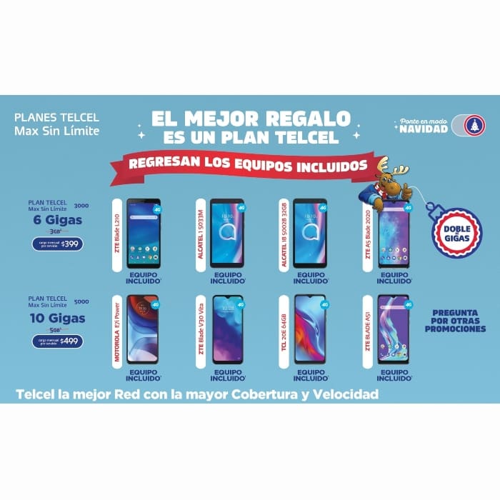 Términos y condiciones: 1. El Pago Inicial es el monto parcial del equipo que debe cubrir el usuario al momento de contratar o renovar, mismo que puede variar dependiendo del equipo y el plazo mínimo de contratación elegido por el usuario. El Pago Inicial del equipo será diferido en 24 pagos mensuales con cargo a la factura Telcel al contratar en un Plan Telcel Max Sin Límite sujeto a un plazo mínimo de contratación de 24 meses. Se podrá solicitar un enganche de hasta el 60% en función del historial crediticio y/o de pago del Cliente. El pago diferido está sujeto a aprobación y evaluación de capacidad de pago. Los equipos ZTE Blade L210, ALCATEL 15033M, ALCATEL 1B 32GB 5002B Y ZTE Blade A5 2020 son Sin Pago Inicial al contratar el Plan Telcel Max Sin Límite 3000 con plazo forzoso de 24 meses más el cargo mensual por servicio de $399 al mes con plazo forzoso de 24 meses. Los equipos MOTOROLA E7i Power, ZTE Blade V30 VITA, TCL 20E 64GB y ZTE Blade A51 son Sin Pago Inicial al contratar el Plan Plan Telcel Max Sin Límite 5000 con plazo forzoso de 24 meses más el cargo mensual por servicio de $499 al mes con plazo forzoso de 24 meses. 2. Aplica para usuarios nuevos que contraten o activos que renueven su plazo forzoso. Los Gigabytes (GB) otorgados por promoción se aplicarán de forma mensual durante todo el plazo forzoso o durante los primeros 12 meses en plazo libre. Al término del plazo forzoso o de los 12 meses el usuario contará únicamente con los GB incluidos originalmente en el plan. Los GB incluidos en el plan podrán ser utilizados estando en México, E.U.A. o Canadá. La navegación en Internet en E.U.A. o Canadá dependerá de la capacidad y tecnología ofrecida por el operador extranjero. Sujeto a Política de Uso de Servicios Sin Frontera disponible para su consulta en www.telcel.com/sinfrontera. No acumulable con otras promociones que otorguen GB de regalo. Vigencia en toda la República Mexicana excepto Gudad de México, Estado de México, Hidalgo y Morelos, a través de Centros de Atención a Clientes y Distribuidores Autorizados Telcel participantes del 03 al 15 de diciembre de 2021. Los precios publicados incluyen IVA del 16%. Información en www.telcel.com, Centros de Atención a Clientes y Distribuidores Autorizados Telcel. LOS SERVICIOS DE TELECOMUNICACIONES OFRECIDOS POR TELCEL SE PRESTAN CON BASE EN LO ESTABLECIDO EN LOS LINEAMIENTOS QUE FIJAN LOS ÍNDICES Y PARÁMETROS DE CALIDAD A QUE DEBERÁN SUJETARSE LOS PRESTADORES DEL SERVICIO MÓVIL, vigentes. Registro Público de Telecomunicaciones Folios: 131378, 131379, 131380, 131382, 131383, 131384, 131385, 131388, 131389, 169799, 169800, 169801, 169803, 169804, 169807, 169808, 169809, 169810, 169811, 174702, 214315 y 214329