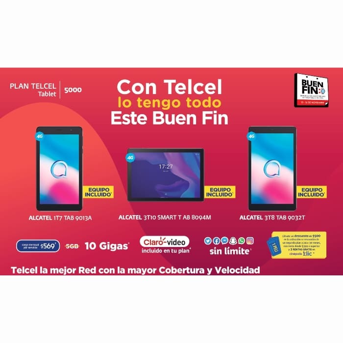 Términos y condiciones: 1. Los equipos ALCATEL 117 90A, ALCATEL 3T10 Smart Tab 8094M y ALCATEL 378 Tab 90327 son equipos incluidos al contratar el Plan Telcel Tablet 5000 sujeto a un plazo mínimo de 24 meses, mismo que puede variar dependiendo del equipo y el plazo mínimo de contratación elegido por el usuario. 2. La renta mensual del Plan Telcel Tablet 5000 es de $569. Imágenes ilustrativas. 3. Aplica para usuarios nuevos que contraten o activos que renueven su plazo forzoso. Los Gigabytes (GB) otorgados por promoción se aplicarán de forma mensual durante todo el plazo forzoso o durante los primero 12 meses en plazo libre. Al término del plazo forzoso o de los 12 meses el usuario contará únicamente con los GB incluidos originalmente en el plan. Los GB induidos en el plan podrán ser utilizados estando en México, E.U.A. o Canadá. La navegación en Internet en E.U.A. o Canadá dependerá de la capacidad y tecnología ofrecida por el operador extranjero. Sujeto a Política de Uso de Servicios Sin Frontera disponible para su consulta en www.telcel.com/sinfrontera. No acumulable con otras promociones que otorguen GB de regalo. 4. En la contratación o renovación de un Plan Telcel Tablet con renta de $399 o mayor, el usuario obtiene por promoción el beneficio consistente en la suscripción mensual sin costo adicional al servicio de video en Intemet (streaming) “Claro Video” durante toda la vigencia del plazo mínimo contratado y/o mientras la línea se mantenga activa. Condiciones: No presentar adeudos. En caso de que la línea presente adeudos, se perderá el beneficio. Aplica sobre la base de una suscripción por línea que cumpla con los requisitos señalados. No incluye contenidos disponibles en Pago Por Evento (PPV). Si el Plan Tarifario es cancelado a solicitud del titular o por falta de pago, la suscripción a Claro Video será cancelada. Si utiliza la red móvil de datos de Telcel para el uso y acceso a Claro Video, los Gigabytes (GB) consumidos se descontarán de los incluidos en el Plan o Paquete de Datos (en caso de contar con alguno) o se cobrarán bajo demanda conforme a la tarifa por consumo de GB adicional vigente, según sea el caso. La disponibilidad y calidad en la prestación del servicio Claro Video, es responsabilidad del tercero que lo ofrece y se prestará conforme a la disponibilidad y calidad ofrecida por el tercero correspondiente. No acumulable con otras promociones. Claro Música Play List 1 mes sin costo, términos y condiciones en www.claromusica.com. Claro Drive 10GB sin costo, términos y condiciones www.darodrive.com. 5. El uso de las aplicaciones Facebook, Messenger, Twitter, WhatsApp, Instagram, Snapchat y UBER se encuentra sujeto a la Política de Uso de Redes Sociales incluidas disponible en www.telcel.com/redessociales. Equipos y color de los equipos sujeto a disponibilidad en punto de venta. Vigencia en toda la República Mexicana excepto Ciudad de México, Estado de México, Hidalgo y Morelos, a través de Centros de Atención a Clientes y Distribuidores Autorizados Telcel participantes del 10 al 17 de noviembre de 2021. Los precios publicados incluyen IVA del 16%. Información en www.telcel.com, Centros de Atención a Clientes y Distribuidores Autorizados Telcel. LOS SERVICIOS DE TELECOMUNICACIONES OFRECIDOS POR TELCEL SE PRESTAN CON BASE EN LO ESTABLECIDO EN LOS LINEAMIENTOS QUE FIJAN LOS INDICES Y PARÁMETROS DE CALIDAD A QUE DEBERÁN SUJETARSE LOS PRESTADORES DEL SERVICIO MÓVIL, vigentes. Registro Público de Telecomunicaciones Folios: 131378, 131379, 131380, 131382, 131383, 131384, 131385, 131388, 131389, 169799, 169800, 169801, 169803, 169804, 169807, 169808, 169809, 169810, 169811, 174702, 214315 y 214329. * En la activación y renovación de un plan a 24/30 meses y con renta desde $399 (IVAinduido) se otorgará un vale de descuento de $500 canjeable al momento de activar o renovar un segundo plan a 24/30 meses con renta desde $399 (IVA incluido) y 2 folios electrónicos para canjear una renta en Cinépolis Klic en la contratación o renovación con plazo forzoso de 24/30 meses con renta mínimo $399 o superior.
