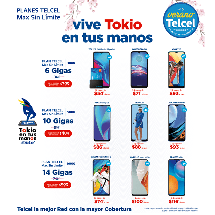 Términos y condiciones: 1. El diferimiento a 24 meses aplica únicamente sobre el Pago Inicial del equipo. El Pago Inicial es el monto parcial del equipo que debe cubrir el usuario al momento de contratar o renovar, mismo que puede variar dependiendo del equipo y el plazo mínimo de contratación elegido por el usuario. El Pago Inicial del equipo será diferido en 24 pagos mensuales con cargo a la factura Telcel al contratar en un Plan Telcel Max Sin Límite sujeto a un plazo mínimo de contratación de 24 meses. Se podrá solicitar un enganche de hasta el 60% en función del historial crediticio y/o de pago del Cliente. El pago diferido está sujeto a aprobación y evaluación de capacidad de pago. I) La cantidad de $54 para el equipo TCL 20E 64GB más Billpocket, la cantidad de $71 para el equipo MOTOROLA E6i y la cantidad de $93 para el equipo VIVO Y11S, corresponde al cargo mensual cuando el Cliente solicita el financiamiento del Pago Inicial (considerando un 10% de enganche y 30% de financiamiento) al contratar un Plan Telcel Max Sin Límite 3000 sujeto a un plazo mínimo de contratación de 24 meses; II) La cantidad de $86 para el equipo REALME C15 QE, la cantidad de $88 para el equipo VIVO Y20 o la cantidad de $93 para el equipo XIAOMI Redmi 9T corresponde al cargo mensual cuando el Cliente solicita el financiamiento del Pago Inicial (considerando un 10% de enganche y 30% de financiamiento) al contratar un Plan Telcel Max Sin Límite 5000 sujeto a un plazo mínimo de contratación de 24 meses; y III) La cantidad de $74 para el equipo XIAOMI Redmi Note 9, la cantidad de $100 para el equipo ONEPLUS Nord N100 o la cantidad de $116 para el equipo HUAWEI Y7A corresponde al cargo mensual cuando el Cliente solicita el financiamiento del Pago Inicial (considerando un 10% de enganche y 30% de financiamiento) al contratar un Plan Telcel Max Sin Límite 6000 sujeto a un plazo mínimo de contratación de 24 meses. 2. Aplica para usuarios nuevos que contraten o activos que renueven su plazo forzoso. Los Gigabytes (GB) otorgados por promoción se aplicarán de forma mensual durante todo el plazo forzoso o durante los primero 12 meses en plazo libre. Al término del plazo forzoso o de los 12 meses el usuario contará únicamente con los GB incluidos originalmente en el plan. Los GB incluidos en el plan podrán ser utilizados estando en México, E.U.A. o Canadá. La navegación en Internet en E.U.A. o Canadá dependerá de la capacidad y tecnología ofrecida por el operador extranjero. Sujeto a Política de Uso de Servicios Sin Frontera disponible para su consulta en www.telcel.com/sinfrontera. No acumulable con otras promociones que otorguen GB de regalo. Vigencia en toda la República Mexicana excepto Ciudad de México, Estado de México, Hidalgo y Morelos, a través de Centros de Atención a Clientes y Distribuidores Autorizados Telcel participantes del 05 al 11 de agosto de 2021. Los precios publicados incluyen IVA del 16%. Información en www.telcel.com, Centros de Atención a Clientes y Distribuidores Autorizados Telcel. LOS SERVICIOS DE TELECOMUNICACIONES OFRECIDOS POR TELCEL SE PRESTAN CON BASE EN LO ESTABLECIDO EN LOS LINEAMIENTOS QUE FIJAN LOS ÍNDICES Y PARÁMETROS DE CALIDAD A QUE DEBERÁN SUJETARSE LOS PRESTADORES DEL SERVICIO MÓVIL, vigentes. Registro Público de Telecomunicaciones Folios: 131378, 131379, 131380, 131382, 131383, 131384, 131385, 131388, 131389, 169799, 169800, 169801, 169803, 169804, 169807, 169808, 169809, 169810, 169811, 174702, 214315 y 214329.