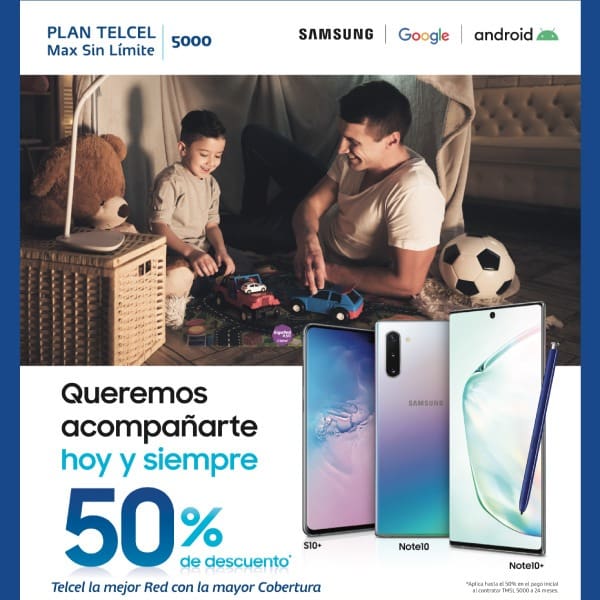 Recibe un 50% de descuento con tu Plan Telcel Max Sin Límite 5000 en un equipo Samsung