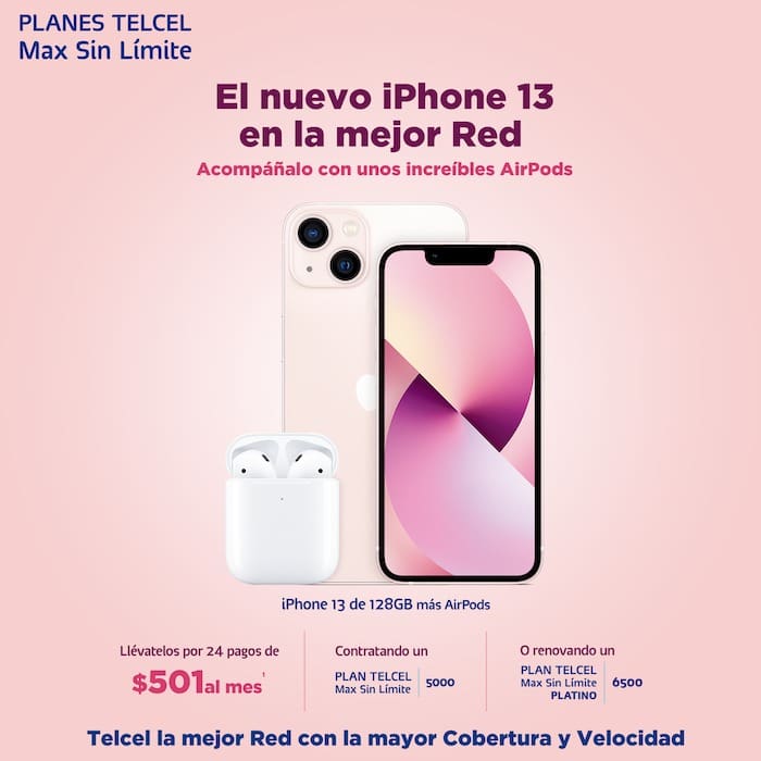 El iPhone 13 puede ser tuyo al llevártelo por 24 pagos de $501 al mes, contratando un Plan Telcel Max Sin Límite 5000 o al renovar un Plan Telcel Max Sin Límite Platino 6500. Con ello no solo podrás disfrutar de tu nuevo smartphone, sino también del Doble de Gigas, redes sociales sin límite y la conectividad a la mejor Red.