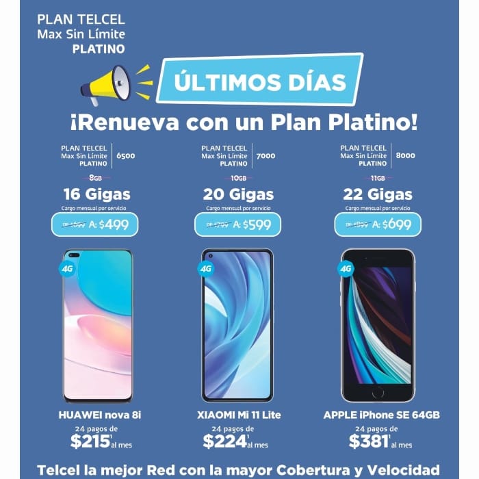 Términos y condiciones: 1. El diferimiento a 24 meses aplica únicamente sobre el Pago Inicial del equipo. El Pago Inicial es el monto parcial del equipo que debe cubrir el usuario al momento de contratar o renovar, mismo que puede variar dependiendo del equipo y el plazo mínimo de contratación elegido por el usuario. El Pago Inicial del equipo será diferido en 24 pagos mensuales con cargo a la factura Telcel al contratar en un Plan Telcel Max Sin Límite Platino sujeto a un plazo mínimo de contratación de 24meses. Se podrá solicitar un enganche de hasta el 60% en función del historial crediticio y/o de pago del Cliente. El pago diferido está sujeto a aprobación y evaluación de capacidad de pago. 1) La cantidad de $215 para el equipo HUAWEI nova 8i corresponde al cargo mensual cuando el Cliente solicita el financiamiento del Pago Inicial (considerando un 10% de enganche y 30% de financiamiento) al contratar un Plan Telcel Max Sin Límite Platino 6500 sujeto a un plazo mínimo de contratación de 24 meses; II) La cantidad de $224 para el equipo XIAOMI Mi 11 Lite corresponde al cargo mensual cuando el Cliente solicita el financiamiento del Pago Inicial (considerando un 10% de enganche y 30% de financiamiento) al contratar un Plan Telcel Max Sin Límite Platino 7000 sujeto a un plazo mínimo de contratación de 24 meses; y III) La cantidad de $381 para el equipo APPLE iPhone SE 64GB corresponde al cargo mensual cuando el Cliente solicita el financiamiento del Pago Inicial (considerando un 10% de enganche y 30% de financiamiento al contratar un Plan Telcel Max Sin Límite Platino 8000 sujeto a un plazo mínimo de contratación de 24 meses. 2. Aplica para usuarios activos que renueven su plazo forzoso. Los Gigabytes (GB) otorgados por promoción se aplicarán de forma mensual durante todo el plazo forzoso o durante los primero 12 meses en plazo libre. Al término del plazo forzoso o de los 12 meses el usuario contará únicamente con los GB induidos originalmente en el plan. Los GBinduidos en el plan podrán ser utilizados estando en México, E.V.A.o Canada. La navegación en Internet en E.U.A. o Canadá dependerá de la capacidad y tecnología ofrecida por el operador extranjero. Sujeto a Política de Uso de Servicios Sin Frontera disponible para su consulta en www.telcel.com/sinfrontera. No acumulable con otras promociones que otorguen GB de regalo. Vigencia en toda la República Mexicana excepto Ciudad de México, Estado de México, Hidalgo y Morelos, a través de Centros de Atención a Clientes y Distribuidores Autorizados Telcel participantes del 07 al 13 de octubre de 2021. Los precios publicados induyen IVA del 16%. Información en www.telcel.com, Centros de Atención a Clientes y Distribuidores Autorizados Telcel. LOS SERVICIOS DE TELECOMUNICACIONES OFRECIDOS POR TELCEL SE PRESTAN CON BASEEN LO ESTABLECIDO EN LOS LINEAMIENTOS QUE FIJAN LOS ÍNDICES Y PARÁMETROS DE CALIDAD A QUE DEBERÁN SUJETARSE LOS PRESTADORES DEL SERVICIO MÓVIL, vigentes. Registro Público de Telecomunicaciones Folios: 131378, 131379,131380, 131382, 131383,131384, 131385, 131388, 131389, 169799,169800, 169801, 169803, 169804, 169807,169808, 169809, 169810,169811, 174702, 214315y 214329.