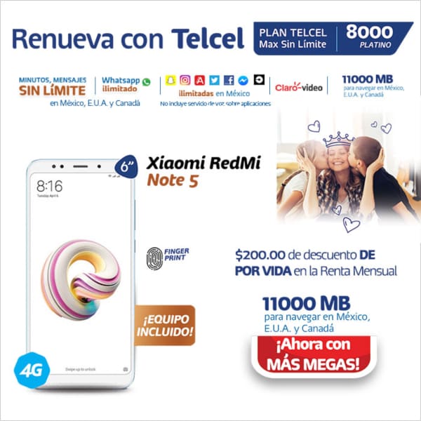 Obtén un descuento de por vida de $200 pesos en la renta mensual de tu Plan Telcel Max Sin Límite 8000 Platino. Y llévate el equipo incluido que más te guste, elige entre un Samsung A20, un Xiaomi RedMi Note 5 o un LG QStylus Plus, por tan sólo $699 pesos al mes. Esta promoción es válida hasta el 22 de mayo.