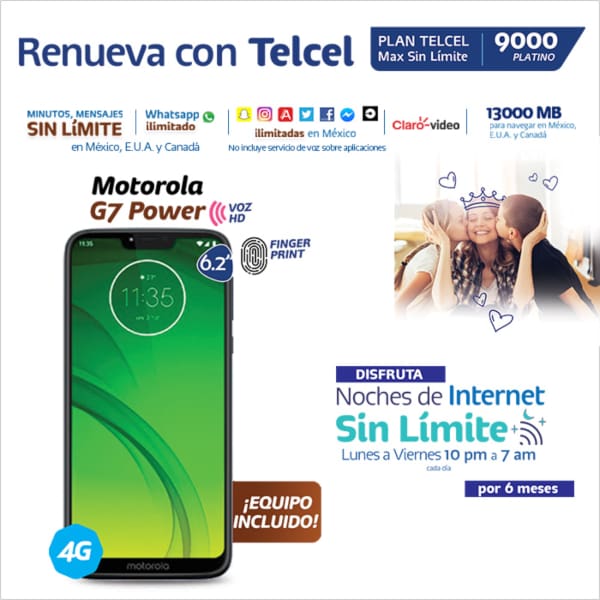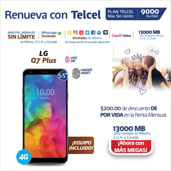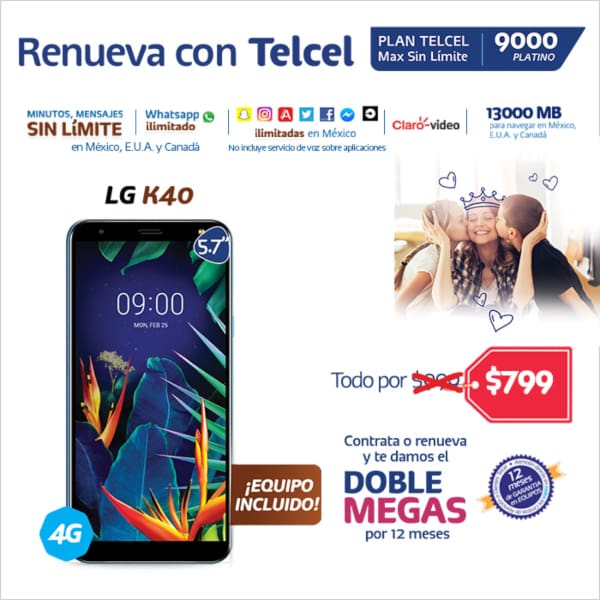 Navega con más de 13000 Mb en México, Estados Unidos y Canadá con Plan Telcel Max Sin Límite 9000 Platino. Lo mejor de todo, es que si contratas ahora te llevarás ¡el doble de megas por 24 meses! Llévate el equipo incluido con la mayor tecnología que vaya con tu estilo: Un LG K40, un LG Q7 Plus o un Motorola G7 Power. Por tan sólo $799 pesos al mes. Esta promoción es válida hasta el 22 de mayo.