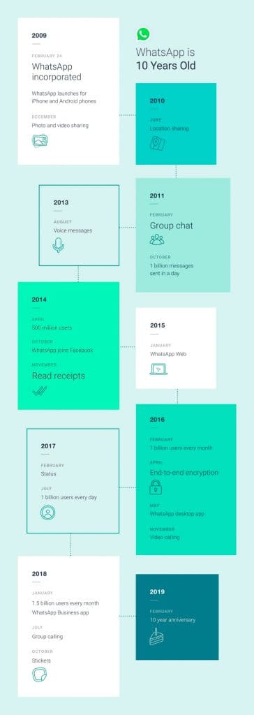 2014: En ese año, la app ya contaba con 500 millones de usuarios. Además, se une a Facebook y se activa la doble palomita en los mensajes.