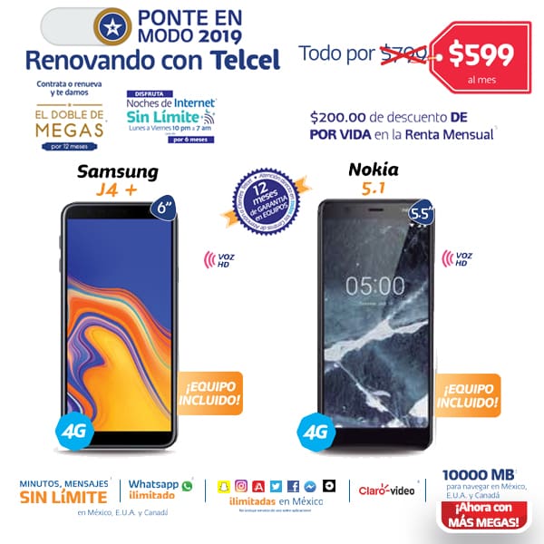 Los equipos incluidos en este Plan Max Sin Límite son: Xiaomi RedMi S2, Samsung J4 + y Nokia 4.1. ¡Todos cuentan con 12 meses de garantía! Consulta los detalles de los Términos y Condiciones en el Centro de Atención a Clientes de tu preferencia. Recuerda que Telcel es la Red.