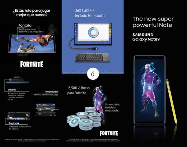 Del 4 de octubre al 31 de diciembre, en la compra de un Note9, podrás llevarte de regalo un Gaming Kit o un PC Kit. El Gaming Kit consiste en 13,500 V-Bucks para que los gastes en skins, bailes, paquetes de llamas piñata o lo que quieras. Por su parte, el PC Kit incluye un HDMI Cable + y un teclado bluetooth plegable. Así es, además de estrenar un smartphone fabuloso, ¡podrás obtener uno de estos increíbles regalos.