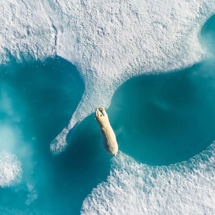 El gran ganador de esta edición de los Drone Awards fue el fotógrafo Florian Ledoux. El colaborador de National Geographic será quien se lleve a casa el Pangea Prize; 500 mil euros en equipo fotográfico y otros beneficios, gracias a su foto Above the Polar Bear. En ella se ve desde lo alto cómo un oso polar cruza bloques de hielo en Nunavut, Canadá. Además de ser una foto bellísima tomada en el momento preciso, la foto del año también retrata las repercusiones que el cambio climático tiene en las especies.