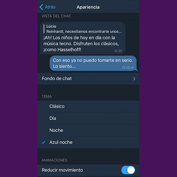 Para activar este modo, ya sea en Android o en iOS, debes ir a Ajustes de Chat, ahí elige Apariencia. Después deberás ir a la sección Tema y ahí elegir Noche, o Azul noche.