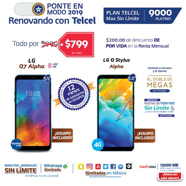 Renueva tu plan y recibe WhatsApp y redes sociales ilimitadas, Noches de Internet Sin Límite por 6 meses, el doble de megas y el catálogo de Claro video. Además de $200 pesos de descuento DE POR VIDA en la renta mensual. ¡Todo por $799 pesos al mes. Los equipos incluidos son el Samsung J6+32GB, el LG Q7 Alpha y el LG Q Stylus Alpha. ¡Todos tienen 12 meses de garantía!