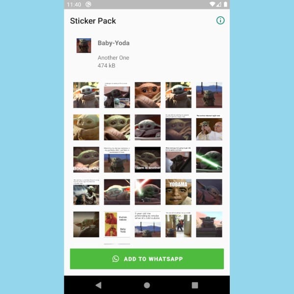 Stickers Baby-Yoda – WAStickerApps: Esta app es un poco más simétrica, ya que añade diferentes escenas, incluyendo memes, dentro de pequeños recuadros.