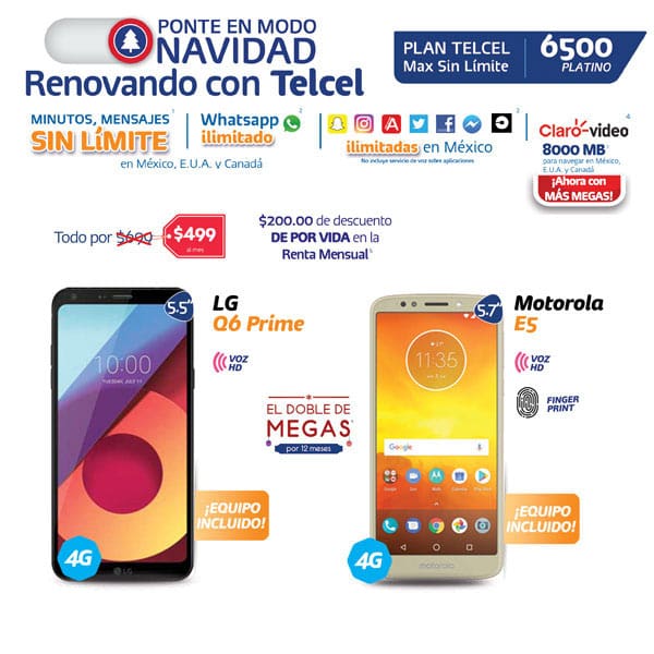 1) Los minutos y Mensajes de Texto (SMS) incluidos aplican para llamar o enviar Mensajes de Texto (SMS) con destino a México, E.U.A. y Canadá, estando dentro de México, E.U.A. o Canadá. El uso de los servicios de voz y SMS ilimitados está sujeto a la Política Antifraude en el Uso de Servicios Ilimitados disponible en www.telcel.com/politicaantifraude, así como, de la Política de Uso de Servicios Sin Frontera disponible en www.telcel.com. 2) Los usuarios que renueven su plazo forzoso con un Plan Telcel Max Sin Límite recibirán como promoción el uso nacional ilimitado sin costo adicional de datos en el servicio de acceso a Internet para los servicios de las aplicaciones denominadas Facebook®, Messenger, Twitter®, Instagram® y Snapchat®; así como, el uso ilimitado en México, E.U.A. y Canadá de la mensajería instantánea WhatsApp®. El uso de las aplicaciones Facebook®, Messenger, Twitter®, WhatsApp®, Instagram® y Snapchat® está referido únicamente a las aplicaciones oficiales propiedad de Facebook® (incluye los dominios www.facebook.com y m.facebook.com); Twitter® (incluye los dominios www.twitter.com y m.twitter.com); Instagram LLC; Snapchat Inc. y WhatsApp Inc. NO ESTÁ INCLUIDO: 1) la carga y descarga de fotos, así como la reproducción y funcionalidad para compartir, reproducir, cargar o descargar videos fuera de las aplicaciones oficiales; 2) el redireccionamiento a cualquier liga (link) o URL fuera de las aplicaciones oficiales, aun cuando la liga haya sido compartida y/o accedida a través de éstas; 3) el servicio de llamadas o servicio de voz a través de las aplicaciones oficiales y/o streaming, 4) compartir una ubicación o consultar la ubicación de cualquier contacto, aun cuando ésta haya sido compartida o accedida a través de las aplicaciones oficiales, 5) La transmisión o reproducción de video en tiempo real “Live Video Streaming” y 6) Cualquier funcionalidad que no esté enlistada como incluida. El uso de las funcionalidades sin costo adicional a través de las aplicaciones Facebook®, Messenger, Twitter®, Instagram® y Snapchat® aplica sólo estando dentro del territorio nacional. El uso de éstas aplicaciones estando en Estados Unidos y Canadá se debitará de los Megabytes (MB) incluidos en el Plan contratado, al término de éstos, bajo demanda conforme a la tarifa por Kilobyte adicional establecida para el Plan contratado o del Paquete de datos adicional que el usuario haya contratado. El uso de las funcionalidades sin costo adicional a través de la aplicación WhatsApp® aplica estando dentro de México, Estados Unidos y/o Canadá. Compatible con equipos BlackBerry con sistema operativo 10 en adelante. Sujeto a la Política de Uso de Redes Sociales y Mensajería Instantánea disponible para consulta en www.telcel.com/redessociales. El beneficio aplica durante toda la vida de la línea. En caso de cancelación de la línea, el beneficio se perderá. Promoción no acumulable con otras promociones que otorguen el uso de redes sociales. App-prende: Es una plataforma de aprendizaje, abierta y ofrece todos los contenidos de ésta plataforma, sin costo de navegación para los usuarios activos de Telcel. Más información aprende.org. Los usuarios que renueven su plazo forzoso con un Plan Telcel Max Sin Límite 3000 en adelante recibirán como promoción el uso nacional ilimitado sin costo adicional de datos en el servicio de acceso a Internet para la aplicación móvil oficial que UBER ha liberado bajo su propia marca UBER®. Incluye: Ingresar a la App y solicitar un servicio de UBER. Seguir el trayecto del conductor que va en camino a recoger al usuario del servicio y hasta que llegue a su destino final. Consultar y actualizar métodos de pago. Consultar histórico de viajes realizados, así como, promociones vigentes dentro de la aplicación. Aplica para conductores UBER. No aplica para el uso de la aplicación UBER EATS. Si la línea es cancelada por el cliente o por falta de pago o el usuario realiza un cambio de plan a uno distinto de los planes participantes, el beneficio se perderá. Cualquier uso no incluido se debitará de los Megabytes incluidos en el Plan y, al término de éstos, se cobrará bajo demanda conforme a la tarifa por KB adicional establecida para el Plan. Válido al 31de diciembre del 2018. 3) Los Megabytes (MB) incluidos en los Planes Telcel Max Sin Límite podrán ser utilizados estando en México, E.U.A. o Canadá. Agotados los MB incluidos en el Plan, se aplicará el cobro por Kilobyte (KB) adicional conforme a la tarifa aplicable. La navegación en Internet en E.U.A. y Canadá dependerá de la capacidad y tecnología ofrecida por el operador extranjero. El servicio estando en E.U.A. y Canadá no es compatible con la navegación en Internet a través del APN de BlackBerry. 4) En la contratación o renovación de un Plan Telcel Max Sin Límite (TMSL) con renta de $399 o mayor, el usuario obtiene por promoción el beneficio consistente en la suscripción mensual sin costo adicional al servicio de video en Internet (streaming) “Claro Video” durante toda la vigencia del plazo mínimo contratado y/o mientras la línea se mantenga activa. Condiciones: No presentar adeudos. En caso de que la línea presente adeudos, se perderá el beneficio. Aplica sobre la base de una suscripción por línea que cumpla con los requisitos señalados. No incluye contenidos disponibles en Pago Por Evento (PPV). Si el Plan Tarifario es cancelado a solicitud del titular o por falta de pago, la suscripción a Claro Video será cancelada. Si utiliza la red móvil de datos de Telcel para el uso y acceso a Claro Video, los Megabytes (MB) consumidos se descontarán de los incluidos en el Plan o Paquete de Datos (en caso de contar con alguno) o se cobrarán bajo demanda conforme a la tarifa por consumo de MB adicional vigente, según sea el caso. La disponibilidad y calidad en la prestación del servicio Claro Video, es responsabilidad de