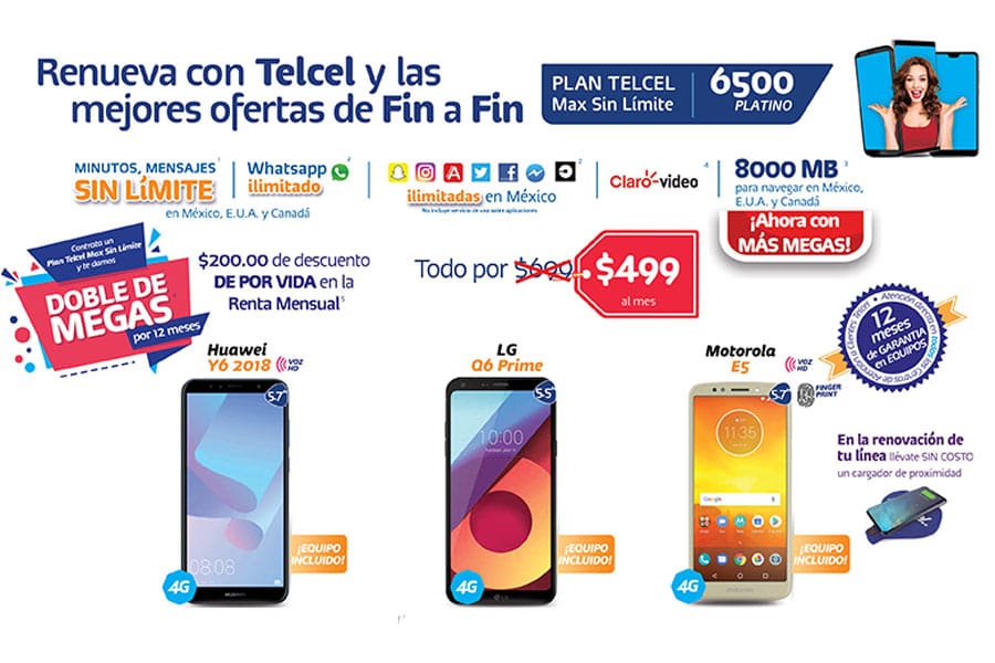 Renueva o contrata un Plan Telcel Max Sin Límite 6500 PLATINO para divertirte con el doble de megas por 12 meses, tus redes sociales favoritas ilimitadas y $200 de descuento DE POR VIDA en la renta mensual. Asimismo, podrás elegir entre increíbles equipos incluidos.