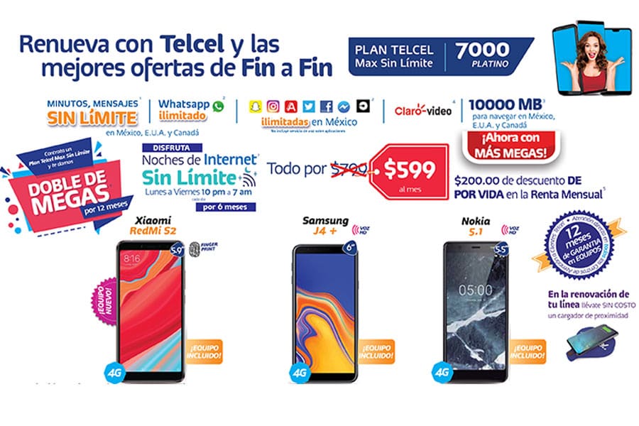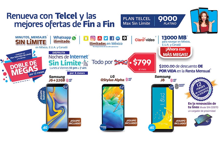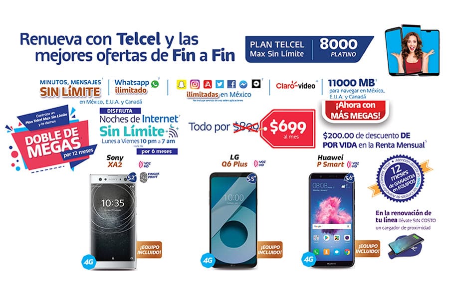 Renueva o contrata un Plan Telcel Max Sin Límite 8000 PLATINO, y obtén tus redes sociales favoritas ilimitadas, el doble de megas por 12 meses y $200 de descuento DE POR VIDA en la renta mensual. Compartir tus selfies o stories a todas horas será super fácil con las noches de internet sin límite y los increíbles equipos incluidos: